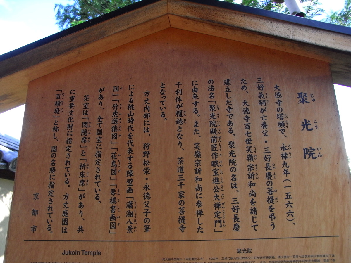 聚光院は、永禄9年(1566)、三好義継が父、長慶の菩提を弔うために、大徳寺第107世住職、笑嶺宗訢(しょうれいそうきん)和尚を開祖として創建した塔頭です。